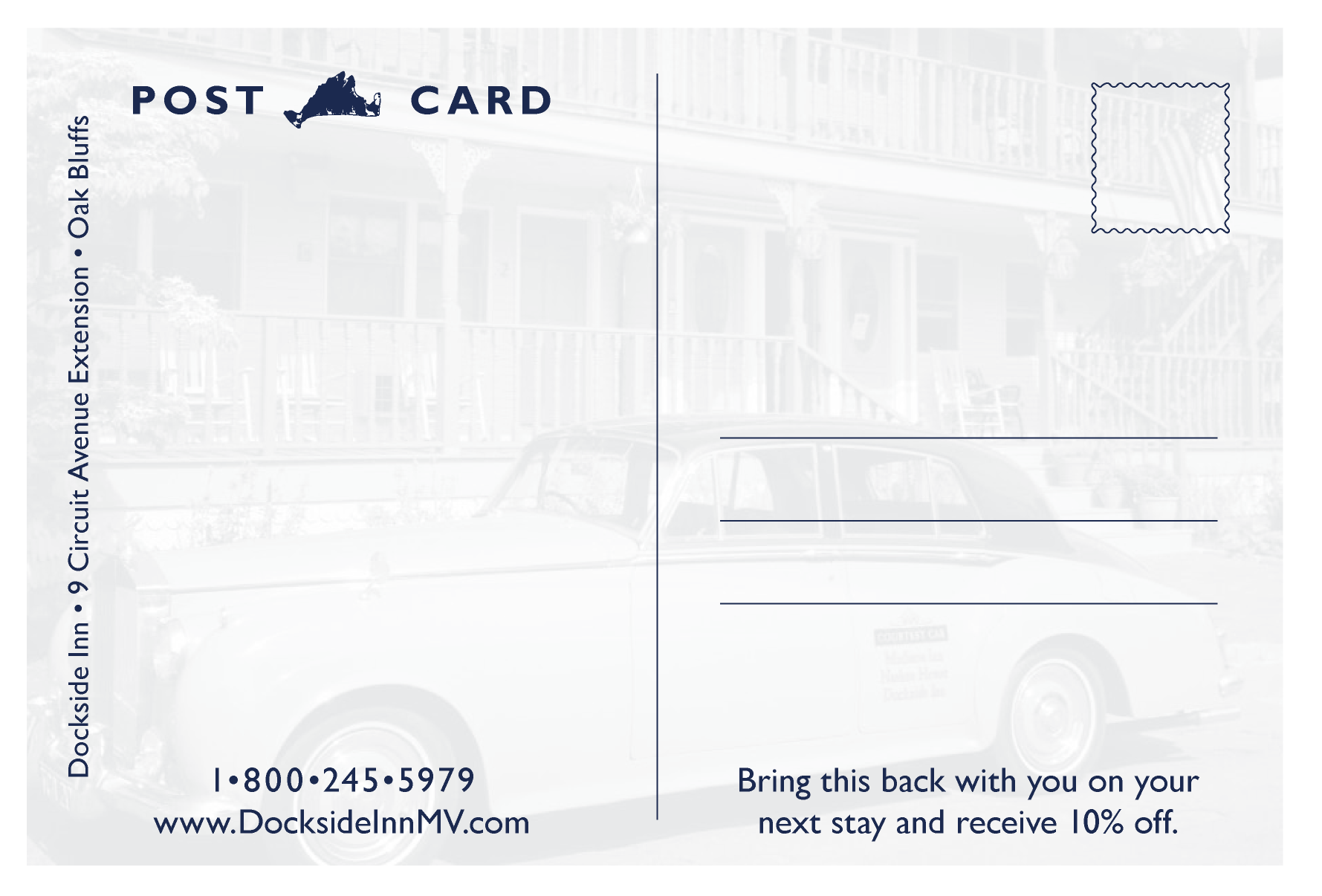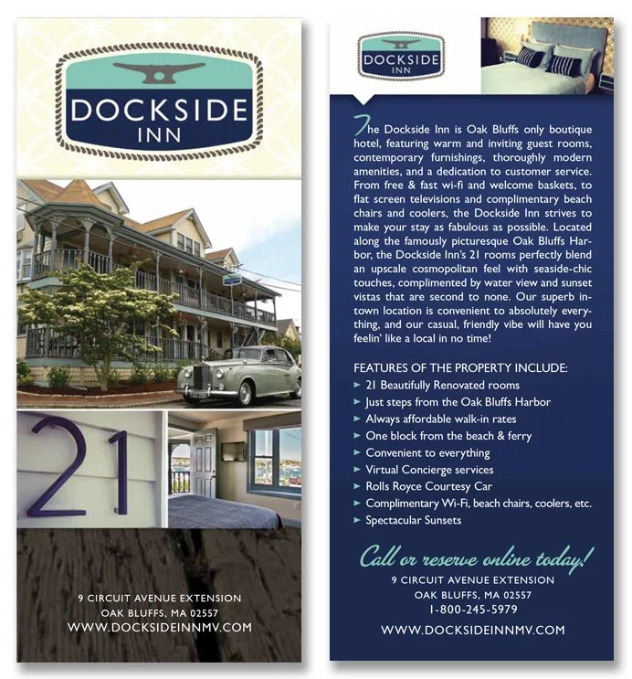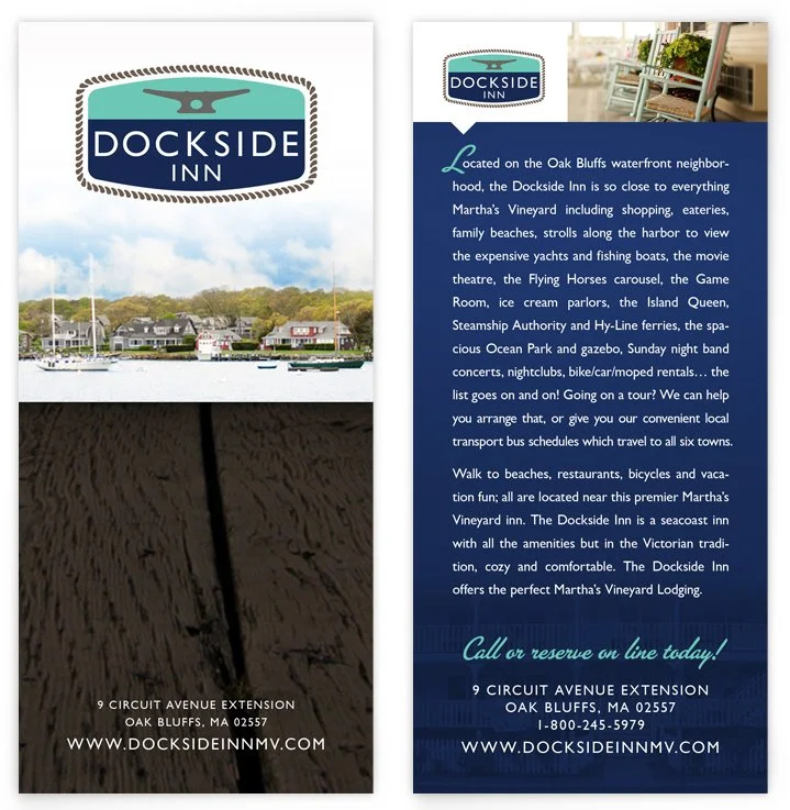 What would a hotel or vacation spot be without rack cards? Cards like these ones we designed for the Dockside Inn can be found in the hotel lobby and they can also be found at tourist spots around the Vineyard. Are you ready to come stay at the Dockside Inn?